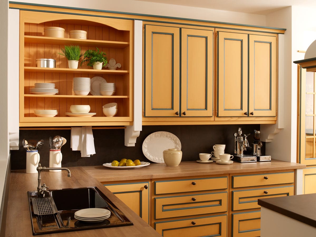 Элитная немецкая кухня в традиционном стиле Camargue сочетание синего и оранжевого элементов